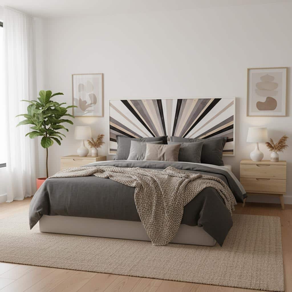 El cabecero está fabricado con materiales de alta calidad y acabado artesanal. Los tonos grises que lo componen, combinados con tintes naturales, le otorgan una belleza sutil y atemporal. La utilización de estos tintes, junto con un barniz al agua ecológico, no solo resalta la textura y los matices de la madera, sino que también asegura un acabado suave y respetuoso con el medio ambiente.