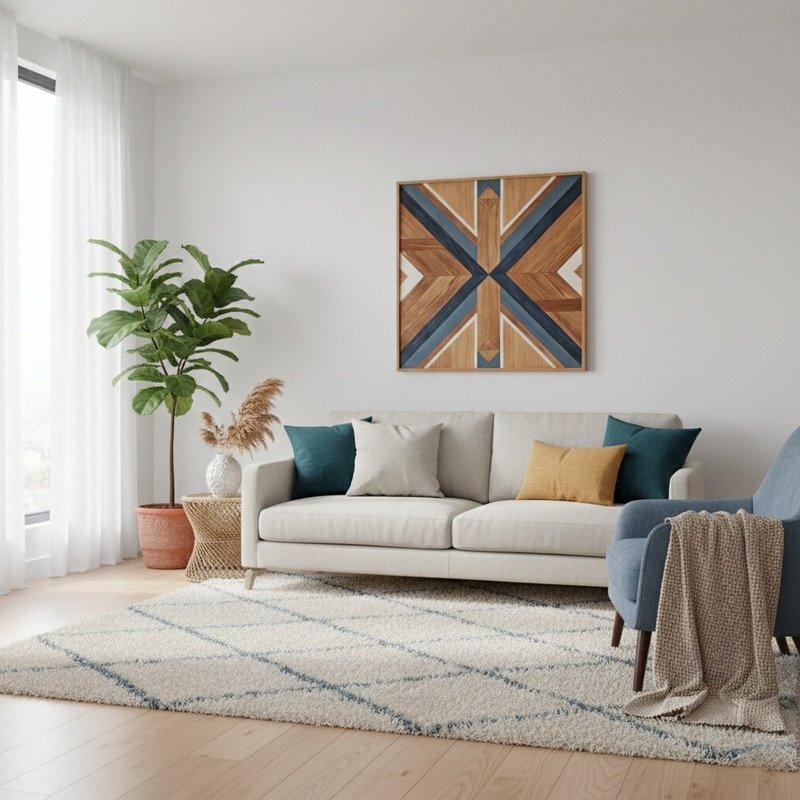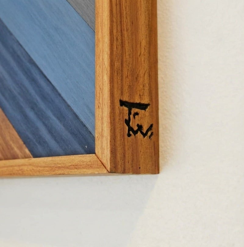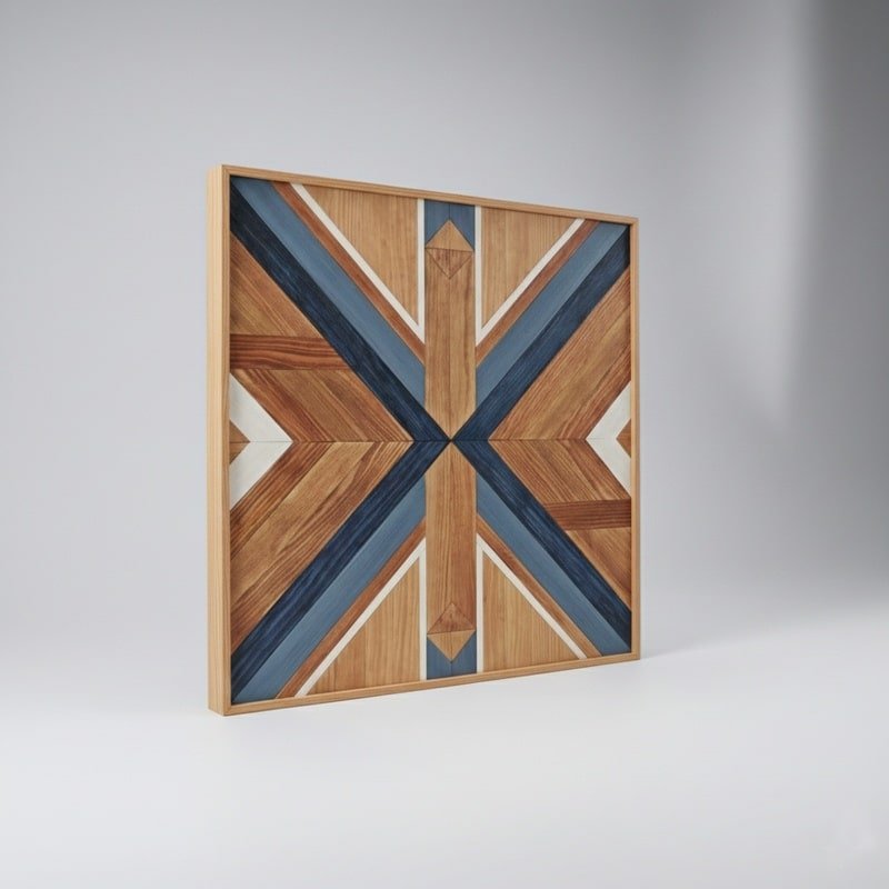 Cuadro artesanal elaborado con piezas de madera natural dispuestas en elegantes líneas geométricas. Sus tonos cuidadosamente teñidos permiten apreciar las vetas auténticas de la madera, creando una pieza moderna, cálida y única.