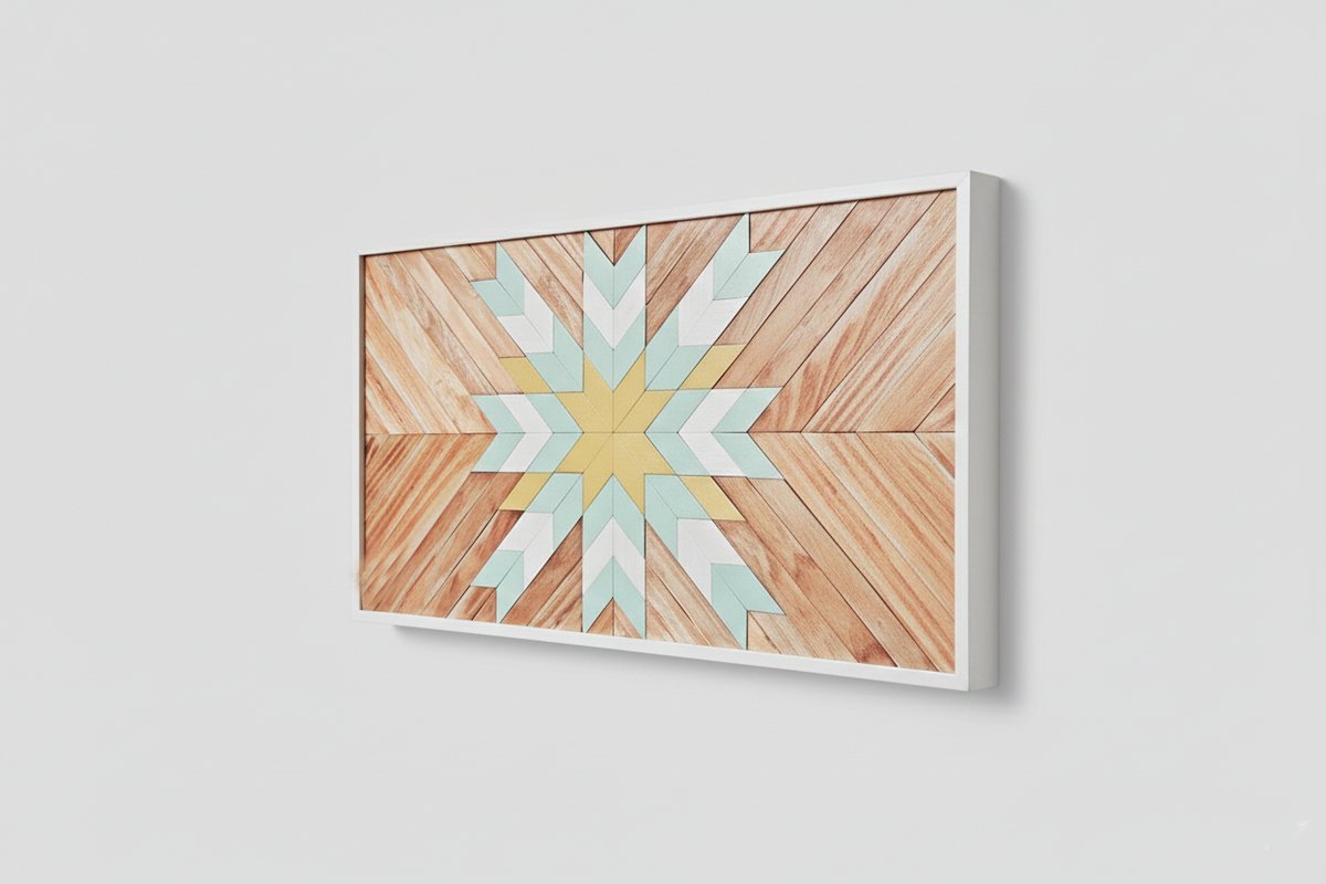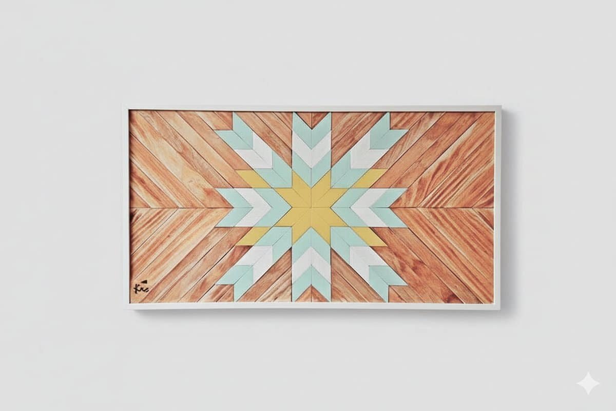 Cuadro artesanal elaborado con madera natural, diseñado con un vibrante patrón geométrico en tonos luminosos que aportan calidez, color y armonía a cualquier espacio