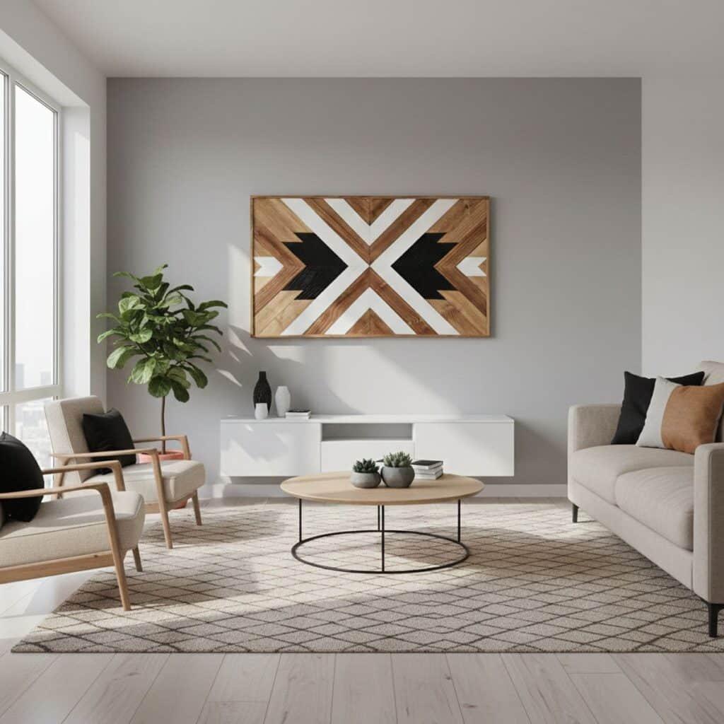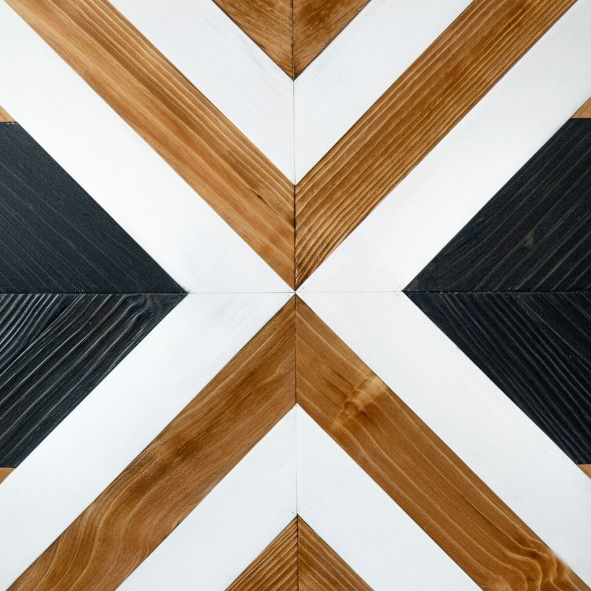 Cuadro geométrico elaborado con madera y tintes naturales con tonos maderas, blanco y negro.