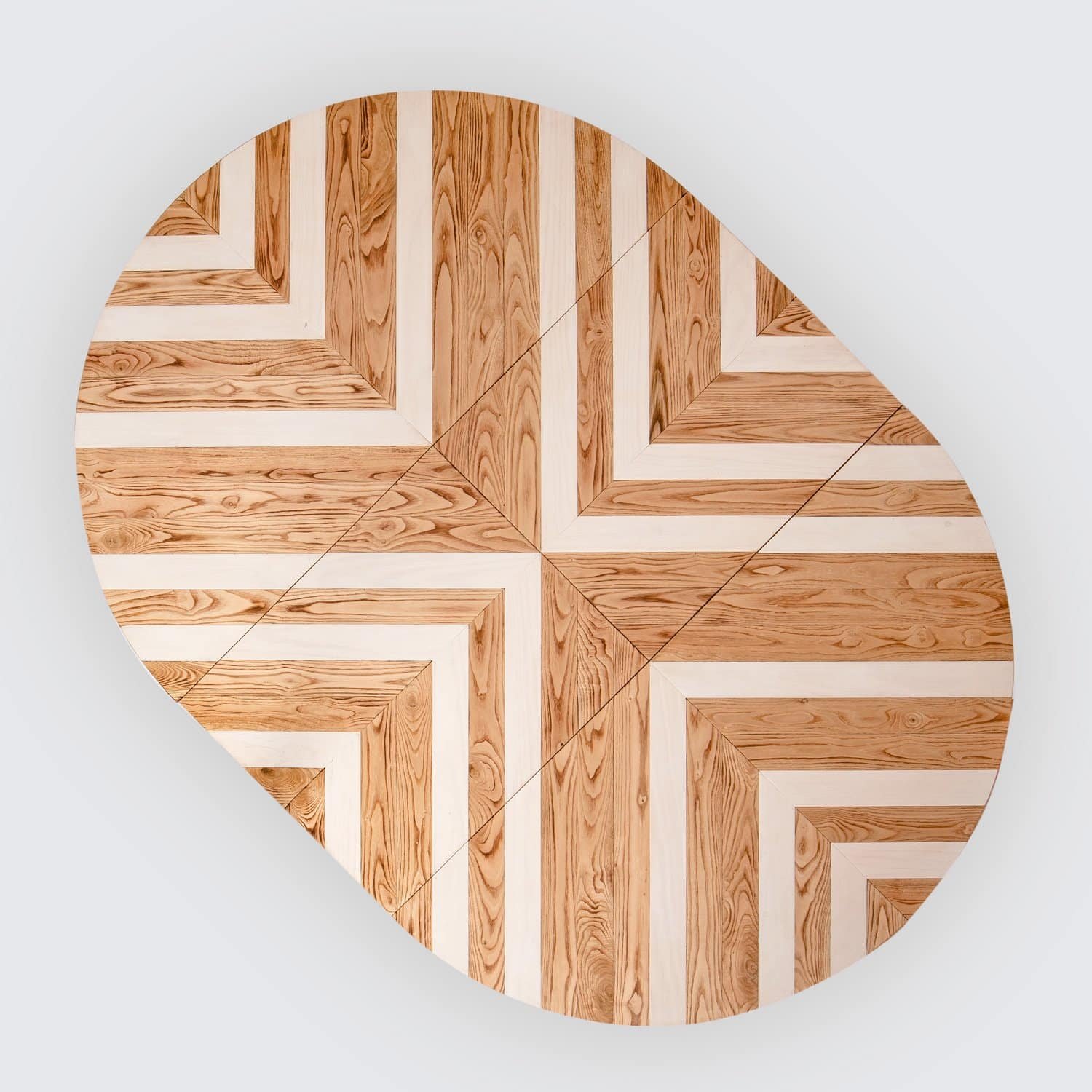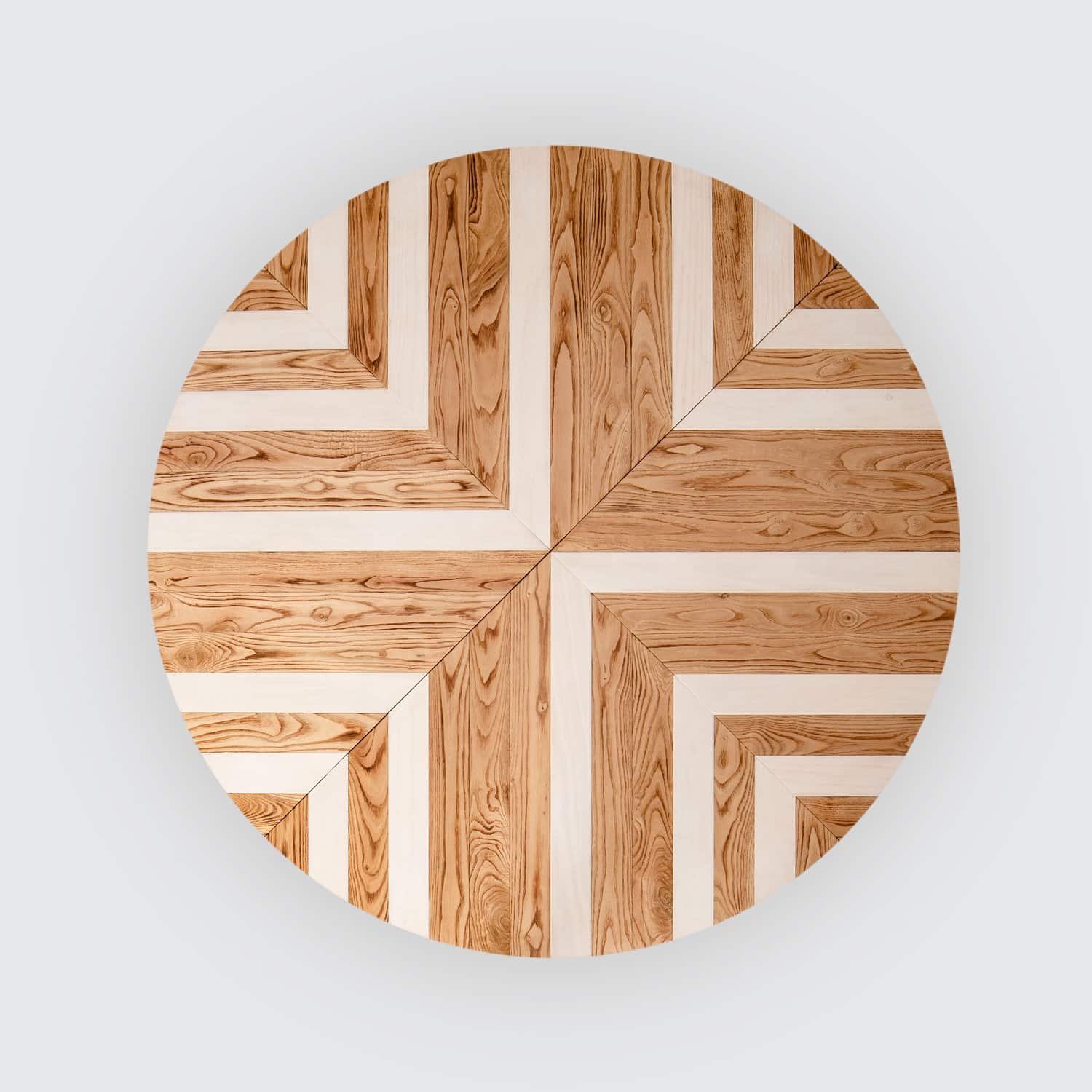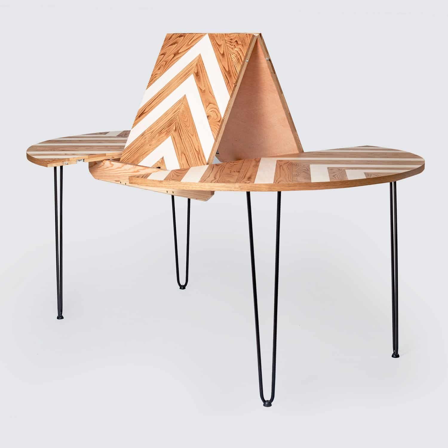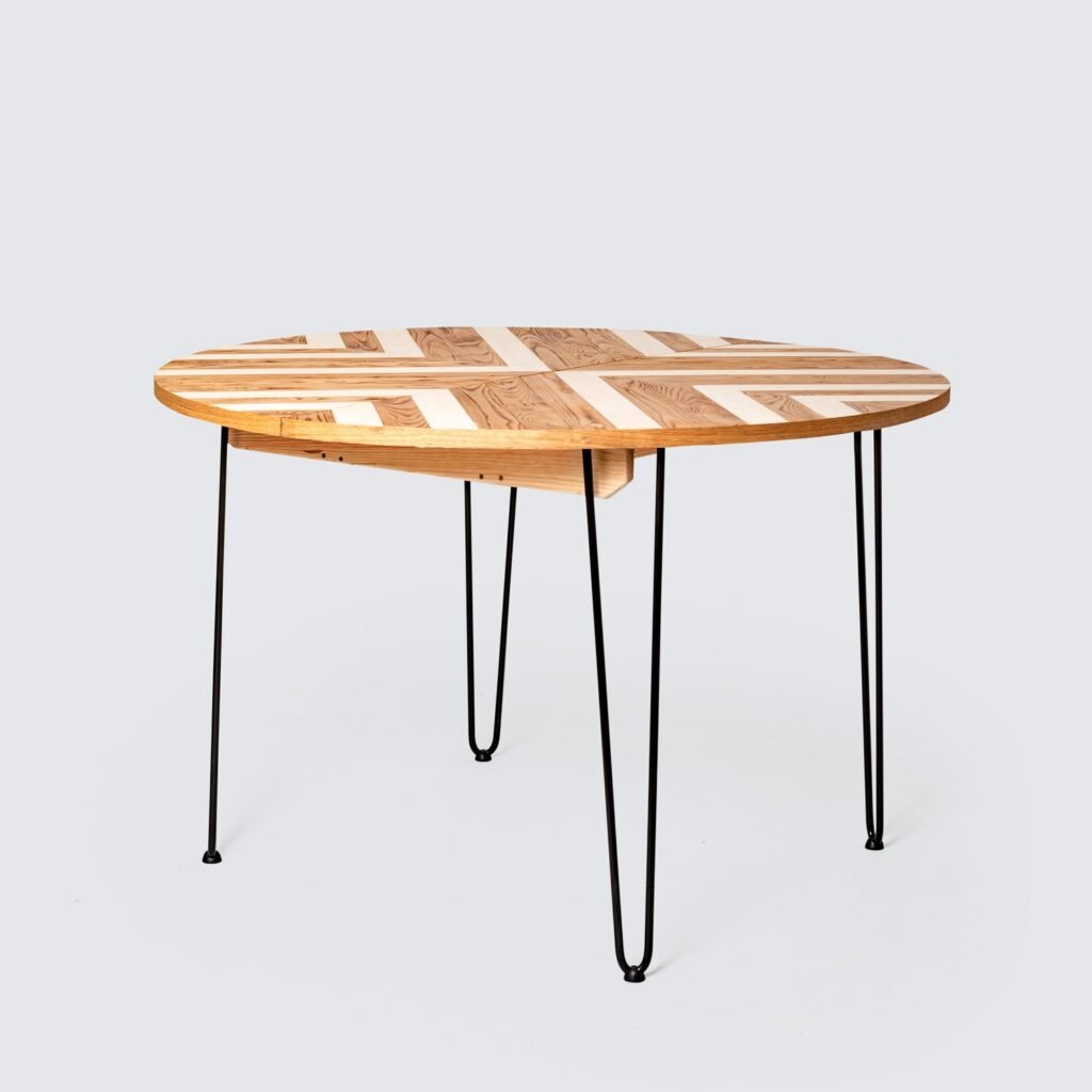 Original mesa circular extensible fabricada con madera de pino sostenible, castaño y tintes naturales.