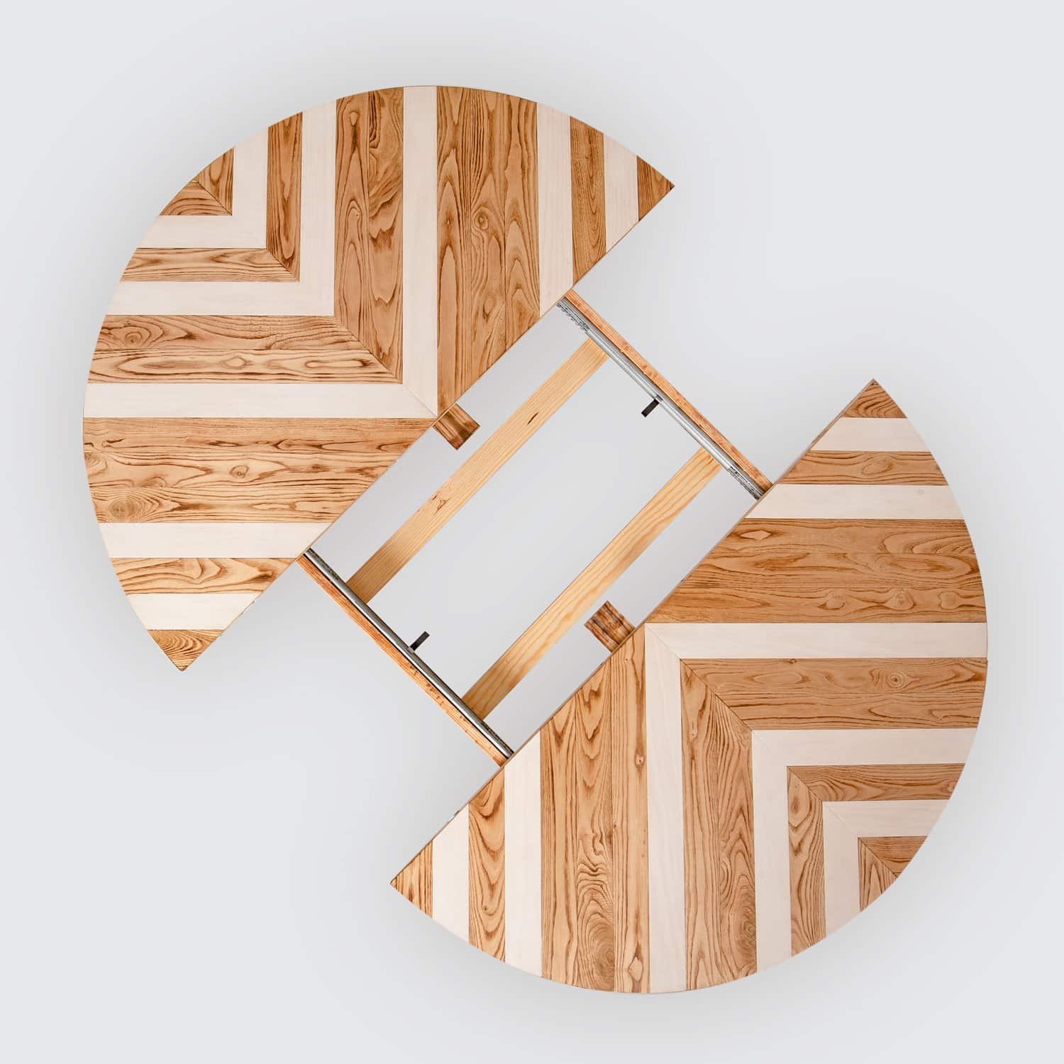 Extendiendo la mesa podrás incorporar el suplemento oculto bajo la mesa y pasar de mesa circular a mesa oval con unos sencillos pasos.