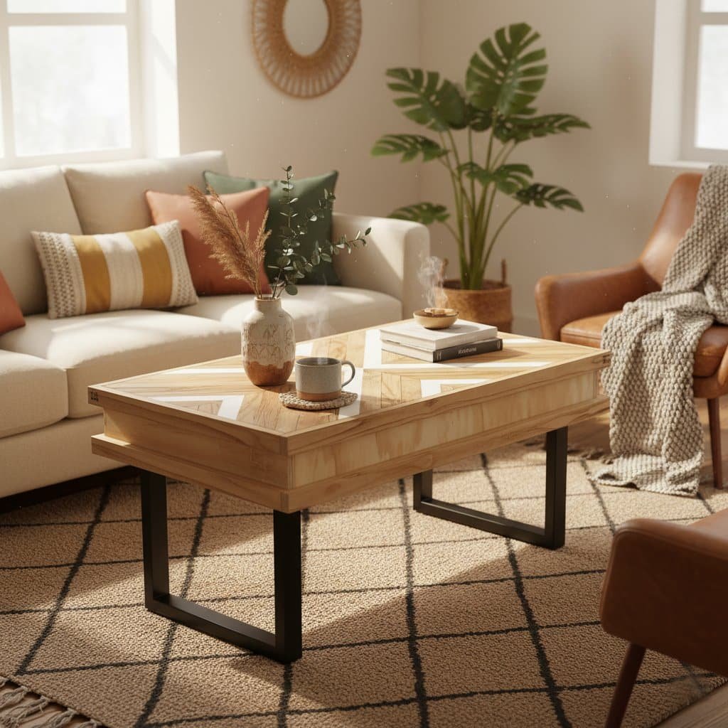 Mesa de centro fabricada con madera sostenible de castaño, cerezo y pino. Cada una de sus piezas es seleccionada para poder formar un bonito patrón de dibujo con la originalidad de las vetas del castaño, resaltamos con técnicas artesanales sus vetas.